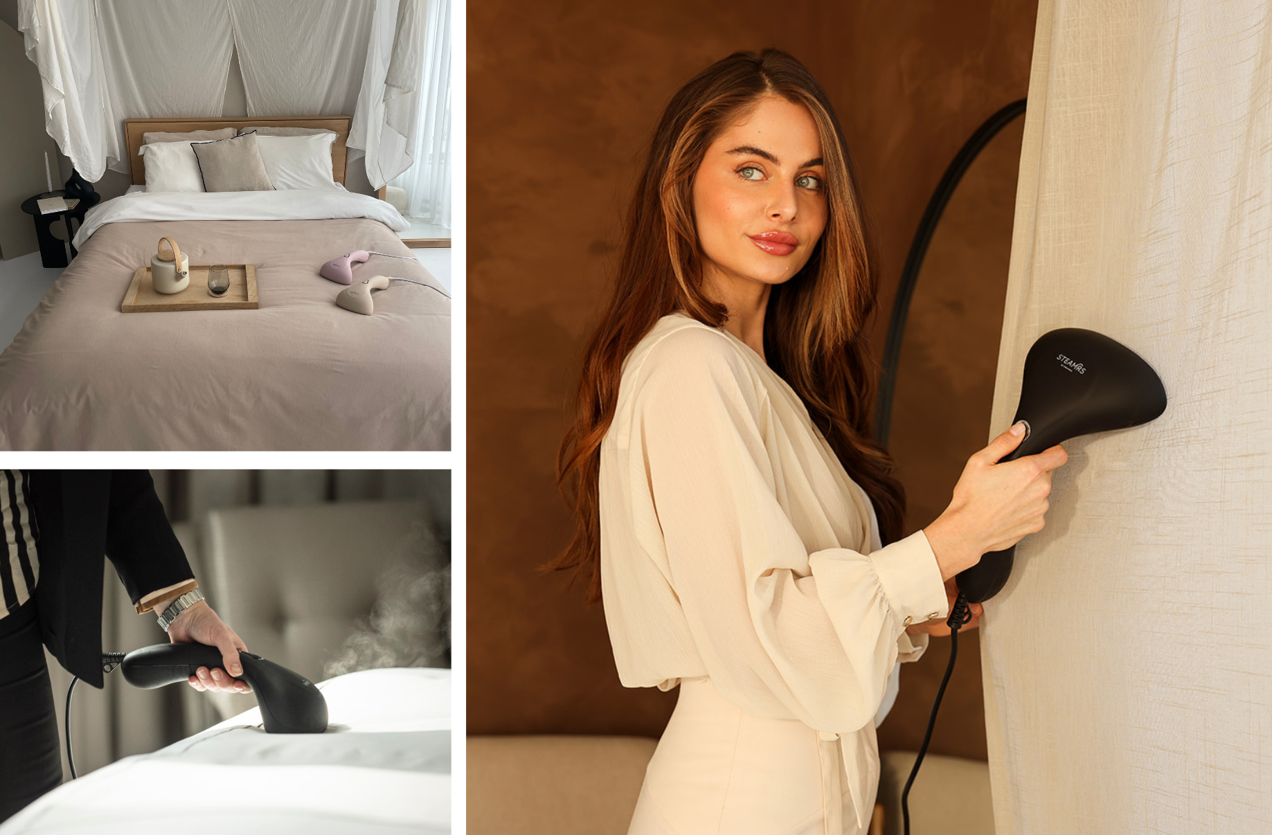 STEAMRS steamers are not only designed to easily remove wrinkles from garments but are also perfect for freshening up and smoothing bedding, upholstered furniture, curtains, table linens, stuffed animals, and more.