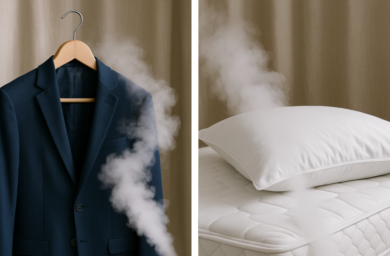 The hot steam kills 99% of all bacteria and germs, and refreshes textiles deep within the fibers. A thorough cleaning of fabrics. Both the handheld and upright steamers from STEAMRS provide this effect.